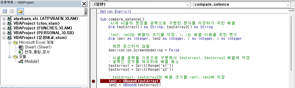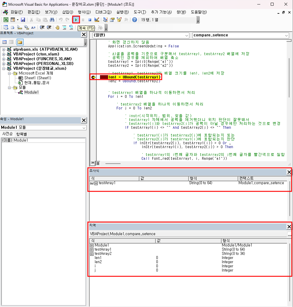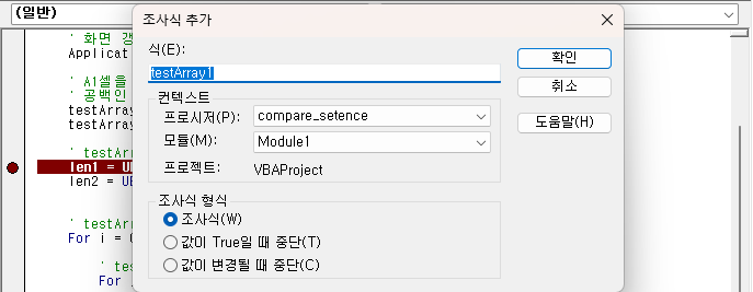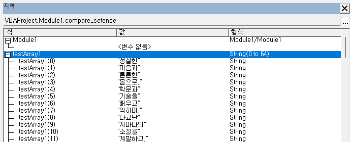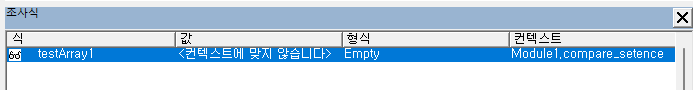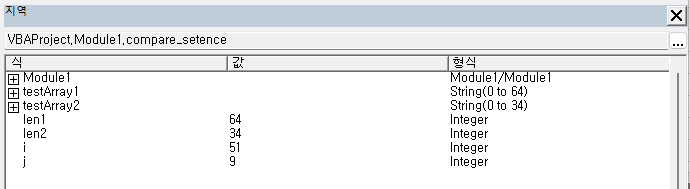 지역 창에는 Module1과 지역 변수인 testArray1, testArray2, len1, len2, i, j 가 보입니다. 그런데 testArray1이 중복되므로 조사식에 추가할 필요가 없었습니다.