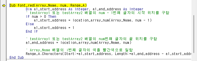 '한 단계씩 코드 실행(F8)'을 누르면 font_red 프로시저로 들어가는데,