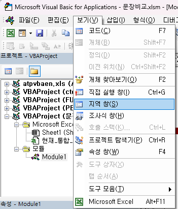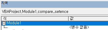 그리고, Module1 왼쪽의 + 버튼을 누르면 변수가 없다고 표시되는데, 여기에 표시되는 변수는 Module1에 공통적으로 사용되는 공용 변수입니다.
