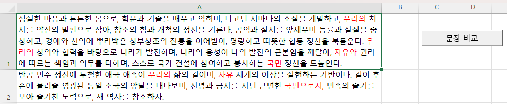 '문장 비교' 단추를 누르면 첫 줄에서는 '우리의', '자유와', '국민'이라는 글자가 빨간 색으로 바뀌고,