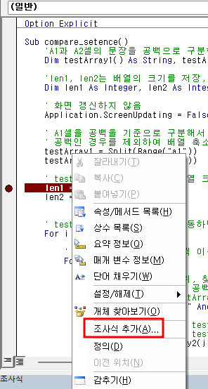 위는 testArray1에 마우스 커서를 놓고, 마우스 오른쪽 버튼을 누른 상태로 여기서 조사식 추가 메뉴를 누르면