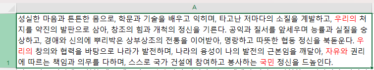 둘째 줄에서는 '우리의', '자유', '국민으로서,'가 빨간 색으로 바뀝니다.