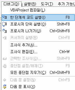 디버그 메뉴 아래를 보면 한 단계씩 코드 실행, 프로시저 단위 실행, 프로시저 나가기, 커서까지 실행 등이 있습니다.
