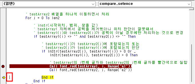 '프로시저 나가기'를 누르면 아래와 같이 font_red 프로시저를 들어가지도 않고, 아래를 모두 실행한 다음 이전 중단점에서 다시 멈춥니다.