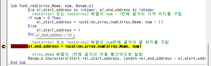 아래와 같이 중단점에서 실행을 멈추게 한 다음 위에 있는 변수명에 마우스 커서를 갖다 대면 a1_start_address 변수의 값 53이 표시됩니다.