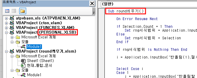 매크로 실행은 개발도구 - 매크로 - round씌우기를 누르면 되며,