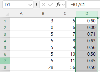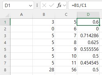 아래와 같이 B열의 숫자를 C열의 숫자로 나누면 값에 따라 소수점이하 자릿수가 다르게 표시됩니다.