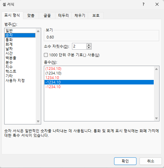 숫자 범주를 선택한 후 오른쪽의 소수 자릿수에서 0을 2로 수정하고 확인 버튼을 누르거나 엔터 키를 누르면 됩니다.