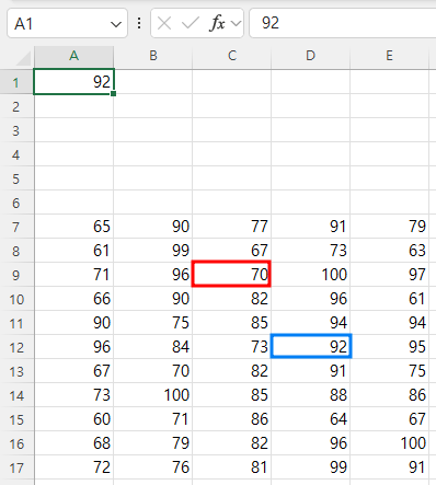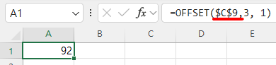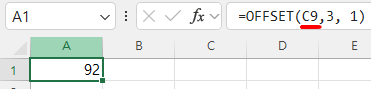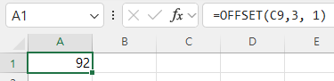 엑셀에서 A1셀의 값을 확인해 보면 C9셀에서 아래로 3칸, 오른쪽으로 한 칸 이동한 셀의 값 92가 구해졌습니다.