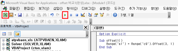 - Range("c9").Offset(3, 1) : C9셀에서 아래로 3칸, 오른쪽으로 1칸 이동하라는 의미입니다. 따라서, D12셀이 되는 것이고, D12셀의 값 92를 반환하는 것입니다.