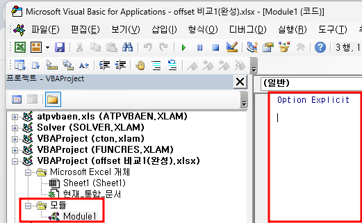 삽입 메뉴에서 모듈을 눌러 모듈을 추가하고,