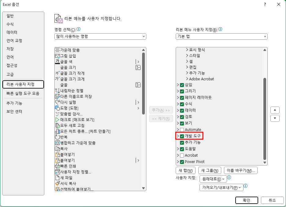 ※ 파일 - 옵션을 누른 후 Excel 옵션 창의 리본 사용자 지정에서 오른쪽 아래의 개발 도구 탭 왼쪽에 체크