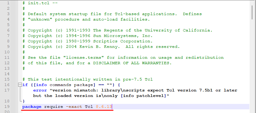 이것도 잘 읽어보면 tk.tcl의 14번째 줄에서 문제가 있다고 하므로 이것을 8.6.13으로 수정하고 실행하면